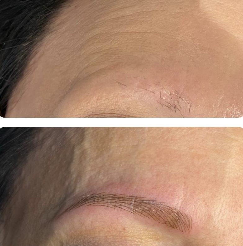 A mix of hairstrokes using a microblading tool and powder look using a machine.